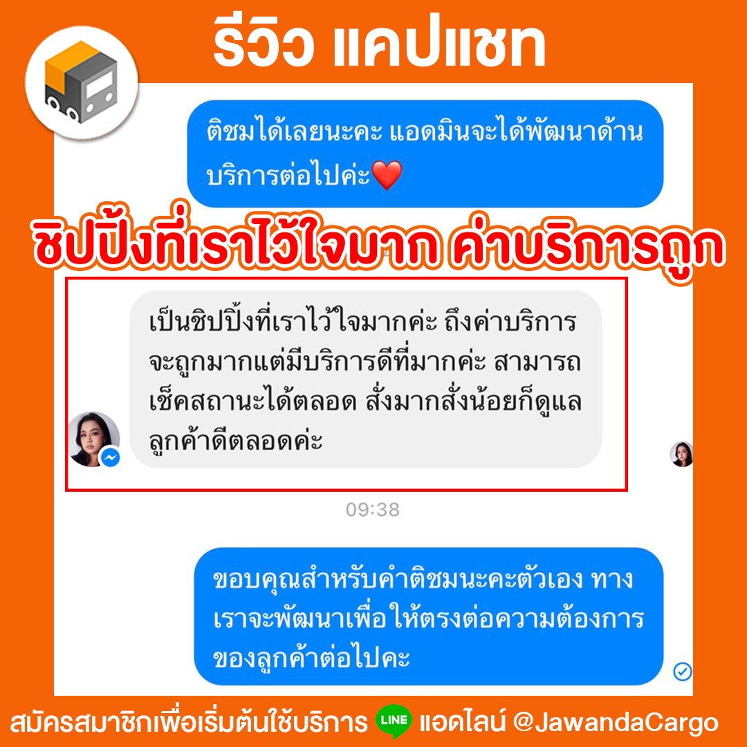 รีวิวทางแชทและคอมเมนท์ของทางเราก็มีมาอย่างล้นหลาม เพราะทาง Jawanda cargo นั้นใส่ใจทุกขั้นตอน ตั้งแต่แรกเริ่มที่คุยให้คำแนะนำ ปรึกษา ไปตลอดจนการสั่งสินค้า คุยราคากับทางร้านจีนให้เพื่อให้ได้ราคาที่ลูกค้าพึงพอใจมากที่สุด